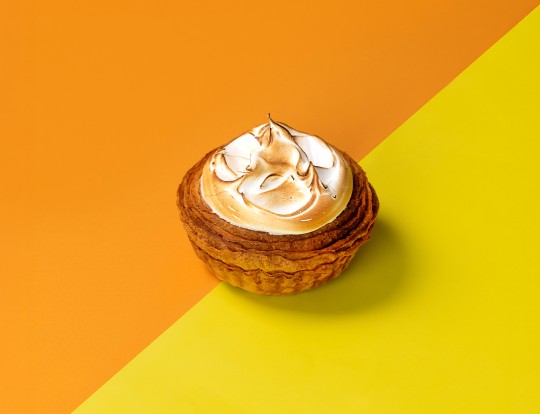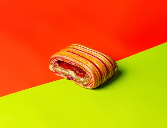 <p>A striking bi-colour pastry, crafted from layers of golden, buttery laminated dough with a vibrant raspberry colour. Inside, a pistachio custard brings rich nutty depth, perfectly balanced by a fresh raspberry and lychee compote that bring sweetness and acidity.</p>